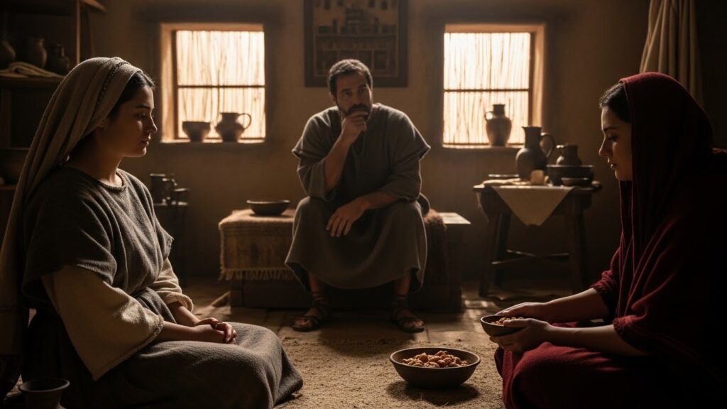 அக்காலத்தில் ஒரு தந்தை கடும் வறுமையில் இருந்தால், தன் மகளைப் பட்டினியால் சாகவிடாமல் இருக்க, ஒரு செல்வந்தர் வீட்டில் பணிப்பெண்ணாக இணைப்பார். இது திருமண ஒப்பந்தம் போன்றது. இதற்குக் கடவுள் விதித்த கடுமையான நிபந்தனைகள்: