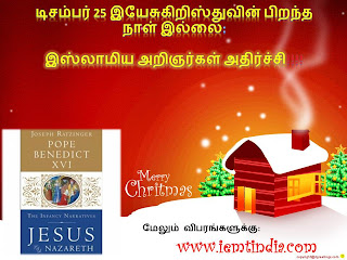 16வது “பென்னடிக்ட்” போப் ஆண்டவர் அவர்களால் எழுதப்பட்டுள்ள ஜீஸஸ் ஆஃப் நஸ்ரேத் : தி இன்பேன்சி நர்ரேடிவ்ஸ் (‘Jesus of Nazareth: The Infancy Narratives’) என்ற புத்தகம் நவம்பர் மாதத்தில் வெளியாகியுள்ளது.அதில் போப் அவர்கள் இயேசு கிறிஸ்துவின் பிறந்த தினத்தை குறித்த விடயங்களை பற்றி எழுதியுள்ள விடயங்கள் புதியவை அல்ல.பல கோடி கிறிஸ்தவர்கள் பல ஆண்டுகளாக பிரசங்கித்து வரும் விசயமே.இது ஏதோ புது விசயம் மாதிரியும்,கிறிஸ்தவர்களுக்கு இது தெரியாத மாதிரியும் இஸ்லாமிய அறிஞர்கள் விளக்குவது நமக்கு விசித்திரமாக உள்ளது.இயேசு கிறிஸ்து பிறந்த ஆண்டை குறித்தும் ,அவர் பிறந்த தேதி குறித்தும் பெரும்பான்மை கிறிஸ்தவர்கள் நன்கு அறிந்தவர்களாகவே உள்ளனர்.குறிப்பிட்ட இந்த விசயங்களை பொருத்த வரை நடைமுறையில் உள்ள விசயங்களோடு ஒத்துப் போவதால் எந்தவிதமான பிரச்சனைகளும் இல்லாதபடியால் கிறிஸ்தவ மக்கள் அவற்றை அப்படியே பின்பற்றுகிறார்கள்.